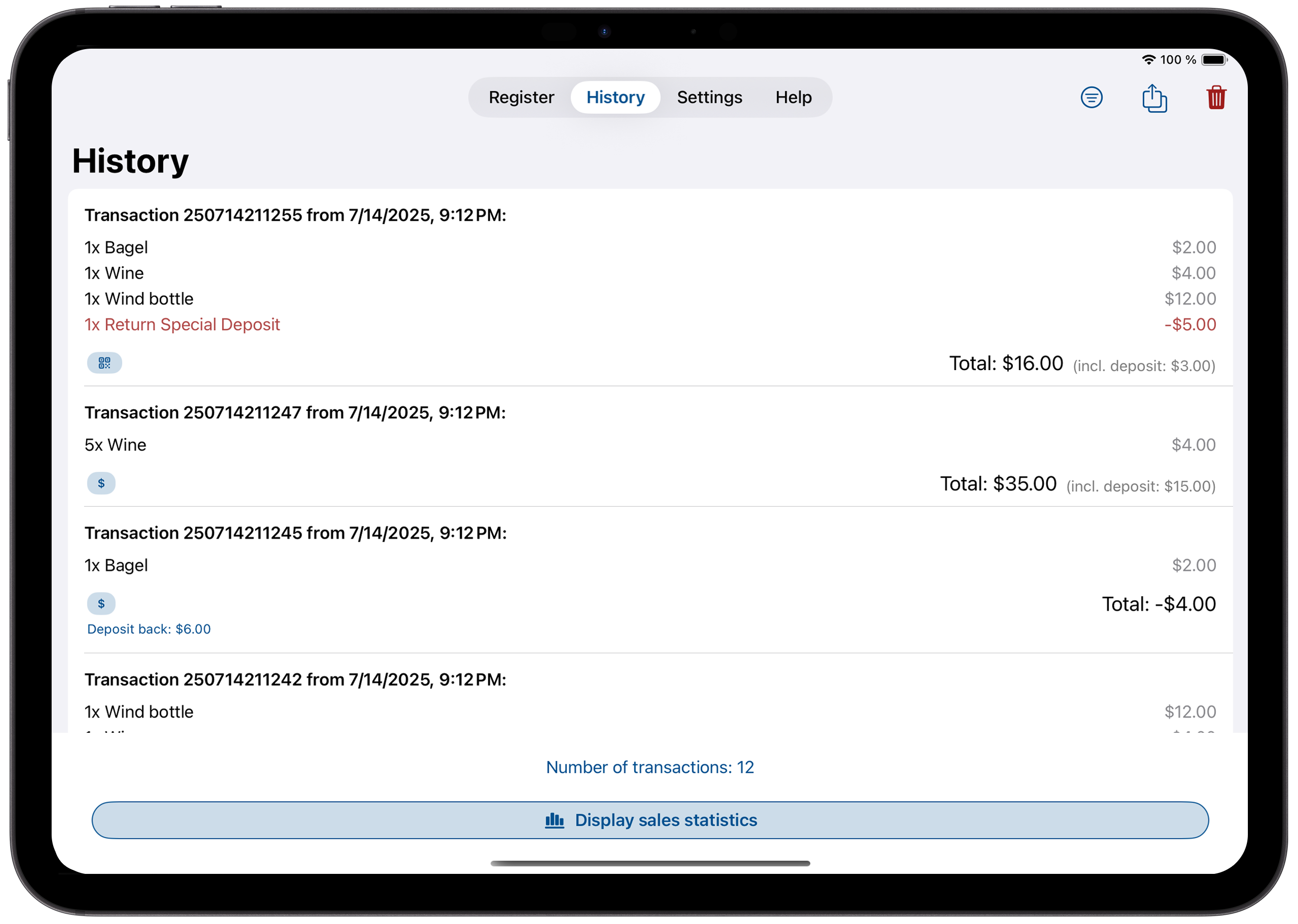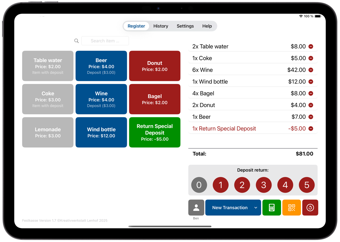 With our app, you can add items with a single tap. Whether drinks, snacks or other products - all prices and articles are clearly displayed. Thanks to the self-explanatory user interface, you can immediately see the sum, the deposit status and calculate deposit returns in no time.