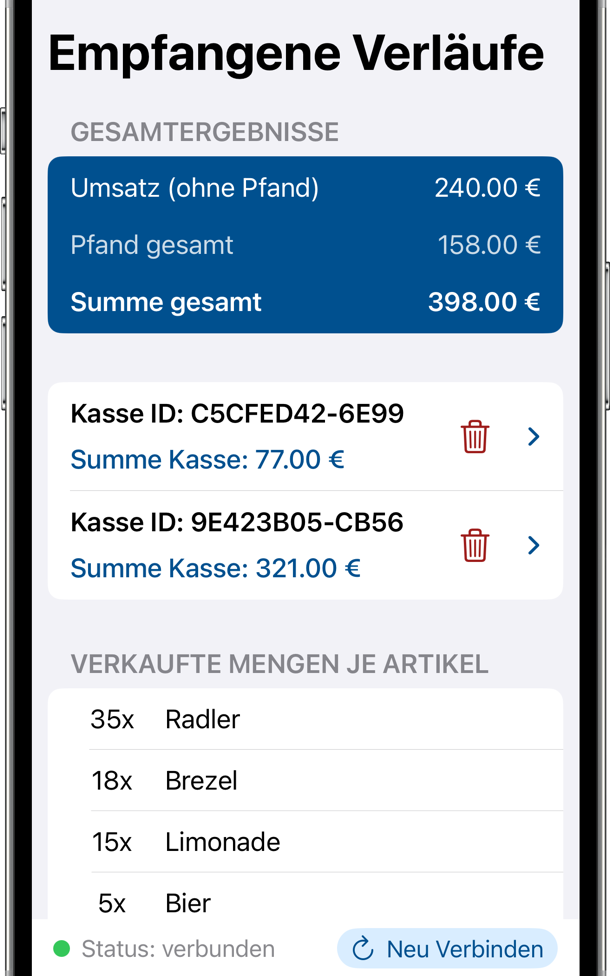 Mit dem Papierkorb kannst du einzelne Kassen aus dem Verlauf entfernen.
